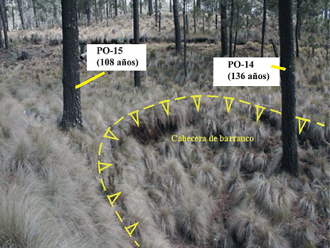 No obstante lo anterior, con base en la edad del arbolado (21 núcleos en 11 árboles de P. hartwegii), se puede decir que no ocurren procesos de ladera significativos en esta barranca desde hace al menos 140 años. Las cabeceras tanto de la barranca principal como de su pequeño afluente son los rasgos geomorfológicos más jóvenes, ya que las edades de los árboles que ahí se desarrollan están entre 80 y ~120 años. La muestra PO-14 es un árbol de 136 años que se encuentra a ~4 m de la cabecera actual, con lo cual puede inferirse que la cabecera ha retrocedido como máximo 4 m en los últimos 136 años (Figura 4).