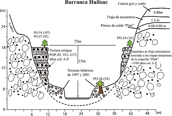 Otra información valiosa se relaciona con la muestra de carbón POP-02 procedente de una terraza lahárica en el interior de la barranca Huiloac (NE del volcán). La edad de 930 - 1170 años cal. A.P. (1105 ± 40 años 14C A.P.) sugiere que la terraza se originó durante las etapas finales de la última explosión pliniana del Popocatépetl, correspondiente a la pómez Pink (Siebe et al., 1996b, 1997). Considerando que: (a) la barranca está excavada en materiales piroclásticos de la erupción Pink, y (b) tiene un relleno lahárico de edad 14C indistinguible de otras fechamientos asociados a la misma erupción, por lo que se propone que la formación de la barranca ocurrió de manera inmediata a la erupción.