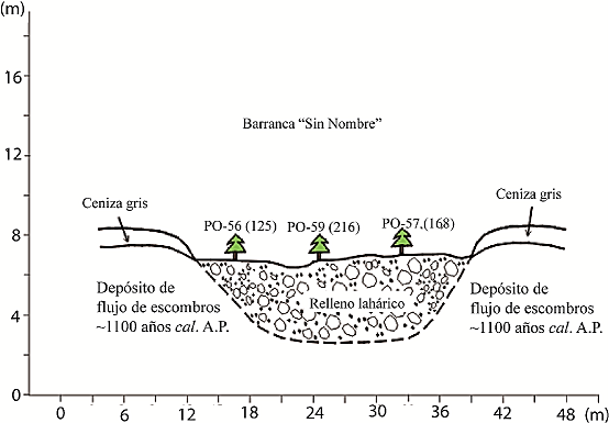Un corte a través de su ladera sur muestra que esta barranca corta en depósitos de flujo piroclástico de la secuencia Tutti-Frutti de hace ~17000 años cal. A.P. (Sosa-Ceballos et al., 2012) y este depósito se encuentra manteado por la pómez Ocre de 5900 - 5600 años cal. A.P. (Siebe et al., 1997) (Figura 2). El espesor de la pómez Ocre en el sitio es de 60 cm. Fragmentos de carbón encontrados en un depósito de flujo piroclástico por debajo de un paleosuelo que a su vez subyace a la pómez de caída Ocre arrojan una edad (2s) de 5993 - 6601 años cal. A.P. (5515 ± 125/-120 años 14C A.P.) (POP-01 en Figura 2 y Tabla 1). Esta edad resulta congruente con la de 5592 - 5891 años cal. A.P. de la pómez Ocre (Arana-Salinas et al., 2010).