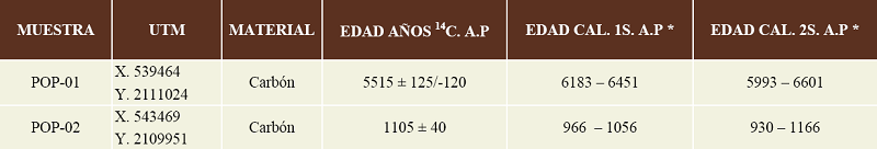 Los fechamientos realizados por 14C complementan y corroboran los resultados de las edades de las tefras determinados en estudios previos y permiten precisar la edad de la formación y desarrollo de las barrancas. La muestra de carbón POP-01 que se colectó dentro de un depósito piroclástico debajo de un paleosuelo sepultado por la pómez Ocre, data de 5990 - 6600 años cal. A.P (5515 ± 125/-120 años 14C A.P). Esto es congruente con la edad del evento eruptivo inmediatamente posterior denominado Ocre, de 5590 - 5890 años cal. A.P. (4965± 65 años 14C A.P.) (Arana-Salinas et al., 2010). Es importante porque señala que en las laderas de la barranca Pelagallinas prevalecieron condiciones de inestabilidad geomorfológica desde la erupción Tutti-Frutti (~17000 años cal. A.P.) hasta un poco antes de la caída de la pómez Ocre, cuando se desarrolló por primera vez un suelo en dicha ladera. Esta fase de pedogénesis debió ocurrir entre ~6600 años cal. A.P. (fechamiento POP-01 de este trabajo) y ~5750 años cal. A.P. (Pómez Ocre) (Figura 2).