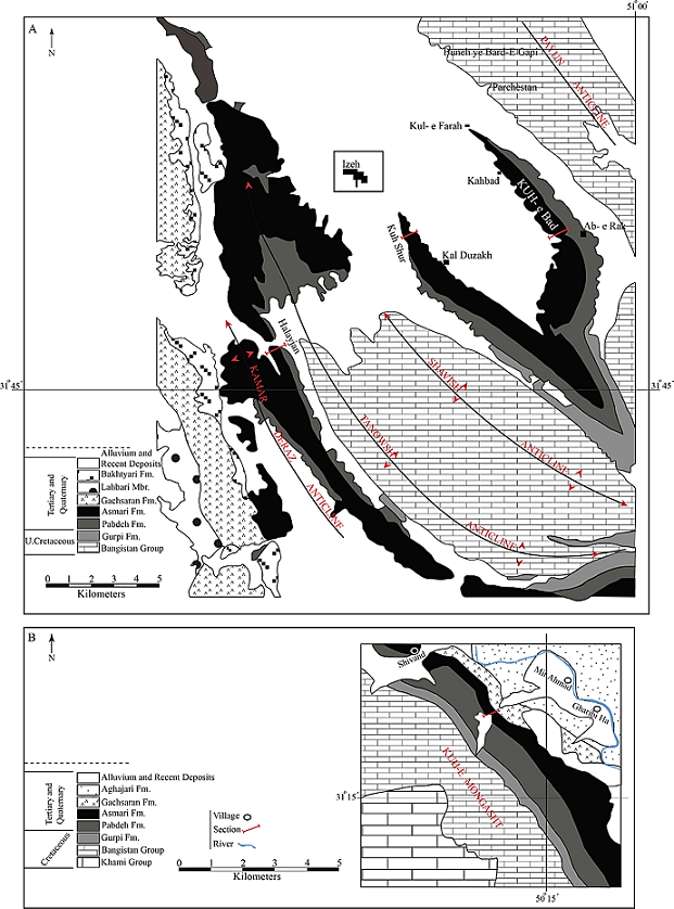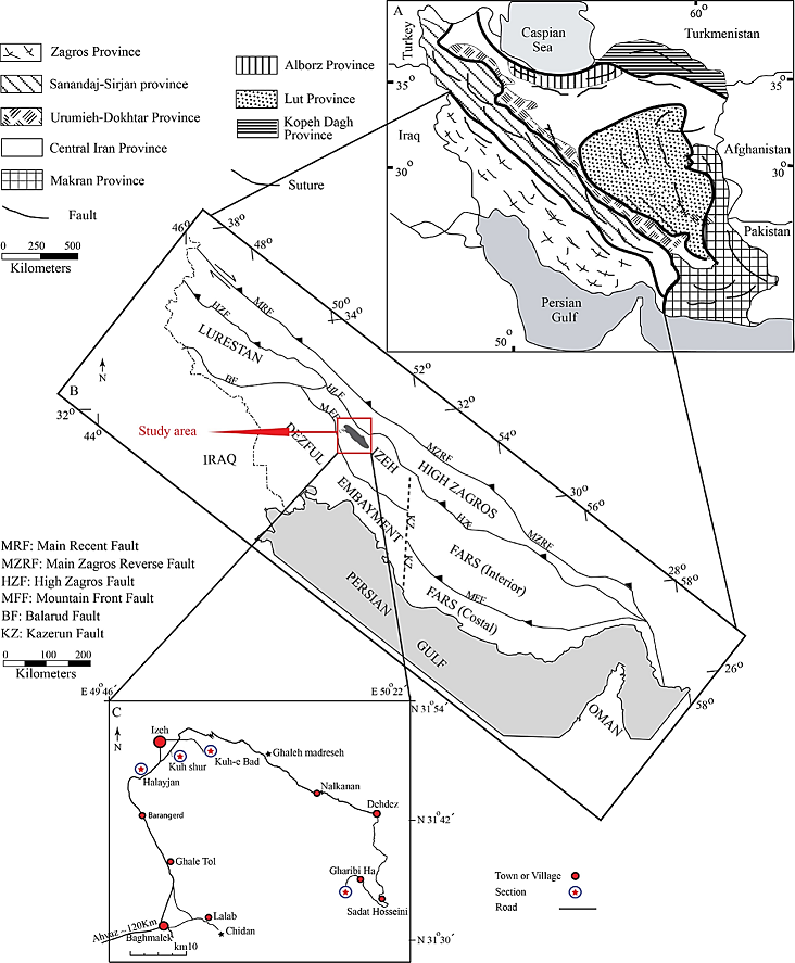The Zagros mountain belt of Iran, a part of the Alpine-Himalayan system, extends from the NW Iranian border to SW Iran, up to the Strait of Hormuz (Figure 1A) (Heydari et al ., 2003). It can be divided into a number of zones (Lurestan, Izeh, Dezful Embayment, Fars, High Zagros), which differ according to their structural style and sedimentary history (Figure 1B). The Asmari Formation is a stratigraphic unit, mostly composed of limestone with subordinate sandstone and shale of approximately Oligocene-Early Miocene age. This formation was developed regionally across the Zagros Mountain range, prograding from the north and the south into the Eocene-Early Miocene Pabdeh Formation (James and Wynd, 1965; Seyrafian et al ., 1996). The Asmari Formation is the main petroleum reservoir in southwest Iran (Beydoun et al ., 1992).