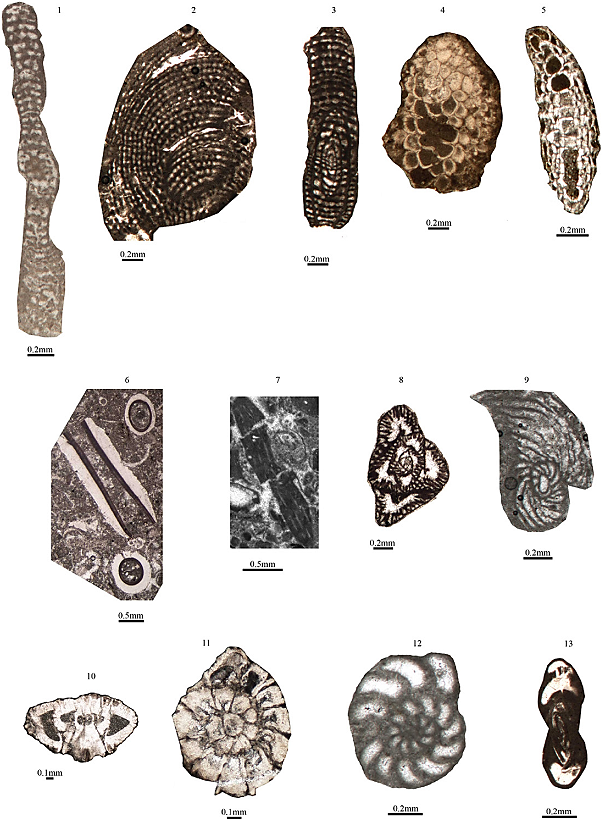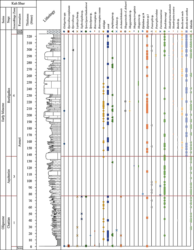 In the Chattian succession of the studied area the most significant and dominant biogenic components are coralline red algae; large, flat and perforate benthic foraminifera (Operculina, Heterostegina, Eulepidina, Nephrolepidina, Spiroclypeus, Amphistegina and Lepidocyclina); and imperforate foraminifera (Archaias, Peneroplis, Dendritina). Other skeletal grains consist of echinoid, gastropod, bryozoan and bivalve fragments (Table 4). Accordingly, the paleoecological conditions of the Asmari Formation during the Chattian could be interpreted as follows: