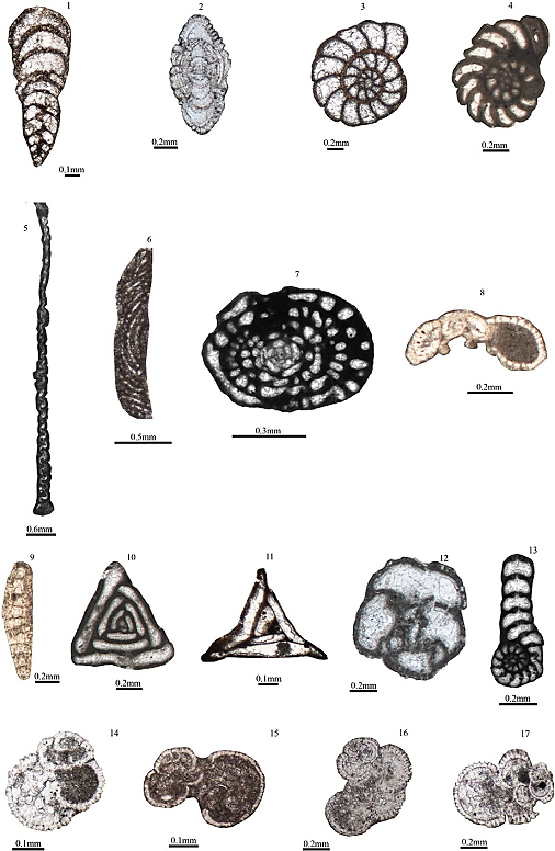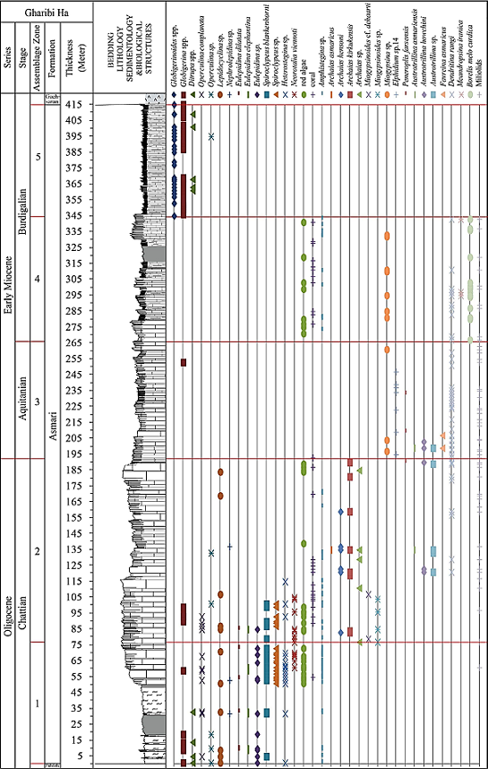 The Oligocene to Miocene benthic and planktonic foraminiferal assemblages, including a total of 17 genera and 23 species, were analyzed to establish the biostratigraphic framework of the Asmari Formation in the studied sections (Figures 6, 7, 8 and 9). From base to top, five Assemblage Zones were recognized (Figures 6, 7, 8, 9 and 10).