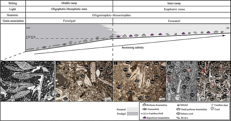 Nummulitids, lepidocyclinids and red algae thrived in oligophotic to mesophotic mid-ramp environments (Kuh-e Bad and Gharibi Ha) preferably at water depths that ranged from 40 to 80 m (Bosence, 1983; Hottinger, 1997; Beavington-Penney and Racey, 2004).