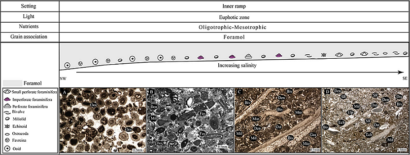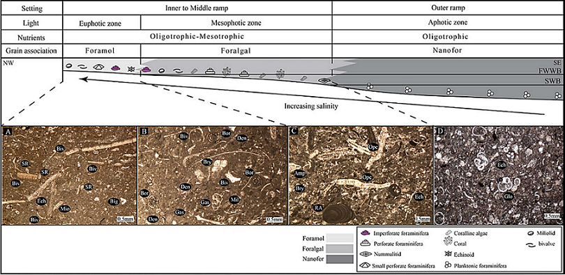 The biotic associations suggest that carbonate sedimentation occurred in tropical to subtropical waters under oligotrophic to mesotrophic conditions. The carbonate grain associations in the Asmari Formation suggest heterozoan association. According to paleoecological parameters (such as: nutrient, depth, light and salinity) in the study area, the Asmari Formation belongs to nannofor-foralgal to foramol association which were deposited in slightly hyper to normal saline environment. In the euphotic zone, abundant imperforate foraminifera are present. Basinward, lens shaped rotalids developed in mesophotic conditions, and large lepidocyclinid-nummulitids characterize the sediments of the deeper oligophotic zone.