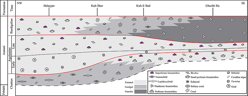 These assemblages of benthic foraminifera are not identified in the Kuh Shur and Halayjan sections, because of their deep-seated paleogeographical position during the Chattian (Figure 10). However, the base of the Asmari Formation deposits, from southeast to northwest, becomes younger and diachronous. Consequently, this stepwise younging could be expected in series with basinward progradation of the Asmari Formation over the basinal shale and marl of the Pabdeh Formation. Some of these progradational architectures (e.g . Eshgar and Gurguda clinoforms) have been documented in different parts of the Asmari depositional basin (Van Buchem et al ., 2010; Shabafrooz et al ., 2015b).