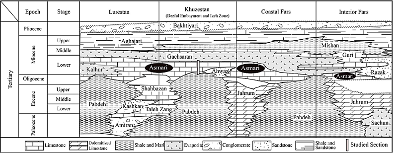 Lithologically, the Asmari Formation, at the type section in Tang-e Gel-e Tursh (Valley of Sour Earth) on the southwestern flank of the Kuh-e Asmari anticline, consists of 314 m of mainly limestone, dolomitic limestone and argillaceous limestone (Motiei, 1993). The shallow marine limestones of the Asmari Formation were conformably deposited over the Pabdeh Formation in the southwestern part of the Zagros Basin (Figure 2) and also unconformably covered the Jahrum and Shahbazan Formations to the northeastern part in the Fars and Lurestan regions (Figure 2). The Oligocene-Miocene in SW Iran is mostly characterized by exclusively shallow water carbonates.