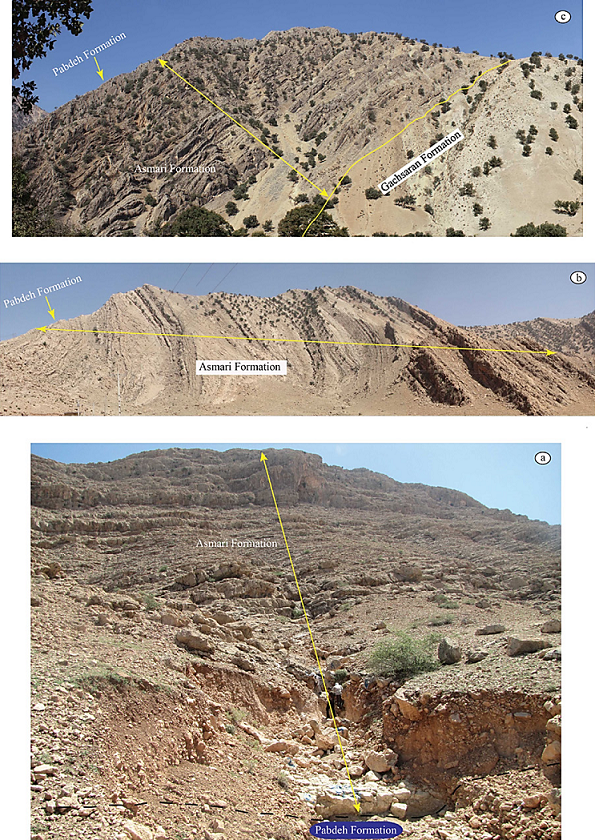 In all studied sections the contact of the Asmari Formation with the underlying Pabdeh Formation is transitional and conformable. The upper contact with Gachsaran Formation is conformable in all studied sections. The Asmari Formation in the study area is mainly composed of thick to medium bedded and massive limestone and subordinate marl and dolomitic limestone intercalations. The overall thickness of the formation vary from northwest to southeast including 330 m, 325 m, 415 m and 416 m in the Halayjan, Kuh Shur, Kuh-e Bad and Gharibi Ha, respectively.