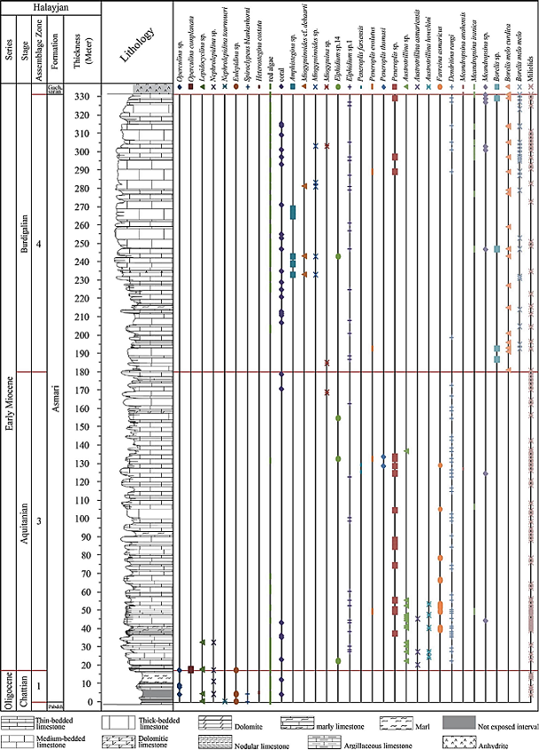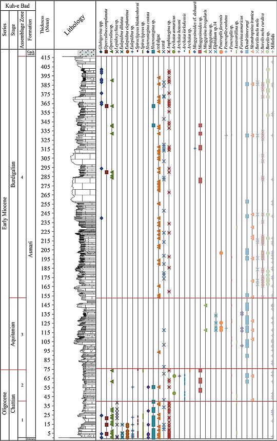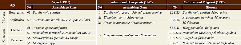 The biostratigraphy of the Asmari Formation was outlined by Wynd (1965) and reviewed by Adams and Bourgeois (1967). Adams and Bourgeois (1967) introduced four assemblage zones for the Asmari Formation (Table 1). They did not differentiate Rupelian from Chattian. These two reports were used by many authors (e.g., Seyrafian, 2000; Vaziri-Moghaddam et al ., 2006; Amirshahkarami et al ., 2007a, b).