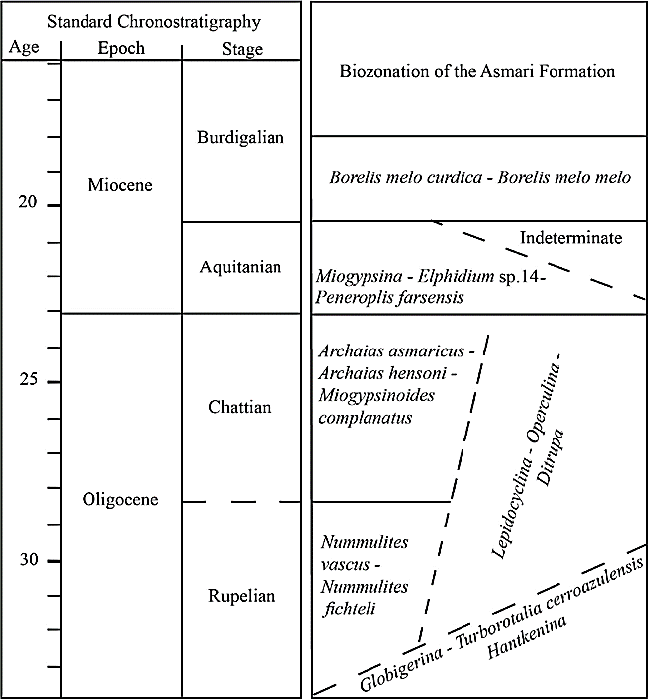 Recently, Ehrenberg et al . (2007), Laursen et al . (2009) and Van Buchem et al . (2010) conducted strontium isotope dating to improve the biostratigraphic ages for the Asmari Formation across most parts of the Zagros basin (Izeh zone and Dezful Embayment) (Table 2). This biozonation is used by many recent authors (e.g ., Allahkarampour Dill et al ., 2010; Van Buchem et al ., 2010; Sooltanian et al ., 2011; Rahmani et al ., 2012). The biozonation scheme of Laursen et al . (2009) and Van Buchem et al . (2010) have some basic differences compared to the old scheme (Adams and Bourgeois, 1967). In the old scheme, the noticeable thickness of the Asmari limestone, containing Archaias, has been considered Aquitanian. Today this interval proved to be Oligocene. Also in the biozonation of Laursen et al . (2009) and Van Buchem et al . (2010), the Oligocene sediments are divided to Rupelian and Chattian.