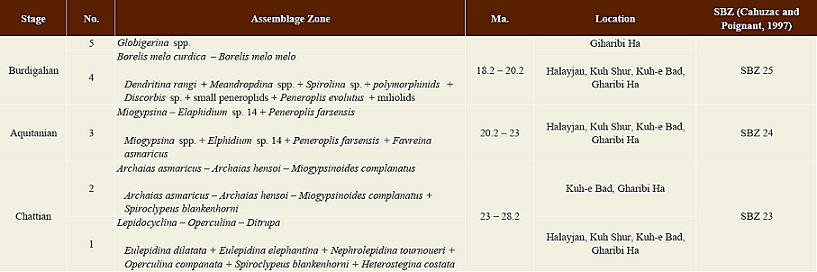 In this research based on the micropaleontological analysis of the larger benthic foraminifera and their distribution, five assemblage zones have been recorded. Three assemblages (1, 3, 4) are present in all sections (Halayjan, Kuh Shur, Kuh-e Bad and Gharibi Ha). Assemblage 2 is recorded in two sections (Kuh-e bad and Gharibi Ha) and assemblage 5 is only occurred in Gharibi Ha section. Assemblages 1 and 2 indicate the Chattian age; assemblage 3 is restricted to the Aquitanian age; and assemblages 4 and 5 suggest the Burdigalian age. According to this study, the age of the Asmari Formation ranges from the Oligocene (Chattian) to Early Miocene (Aquitanian-Burdigalian).