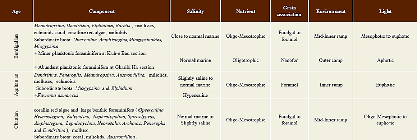 The biotic associations within the Asmari Formation indicate that the lower part of the Asmari Formation (Chattian) was mostly deposited in the oligophotic-mesophotic zone, in normal saline waters. The middle and upper parts of the Asmari Formation is characterized by euphotic-mesophotic biota (except for the Gharibi Ha section, SE of study area, where the sedimentation occur in aphotic situation in Burdigalian). The oligophotic zone is characterized by large and flat lepidocyclinids and nummulitids and corallinacean algae. Lens shaped rotalids abundantly thrived in the mesophotic zone. The euphotic zone is dominated by porcellaneous larger foraminifera and indicates well lit, highly translucent, shallowest part of the photic zone.