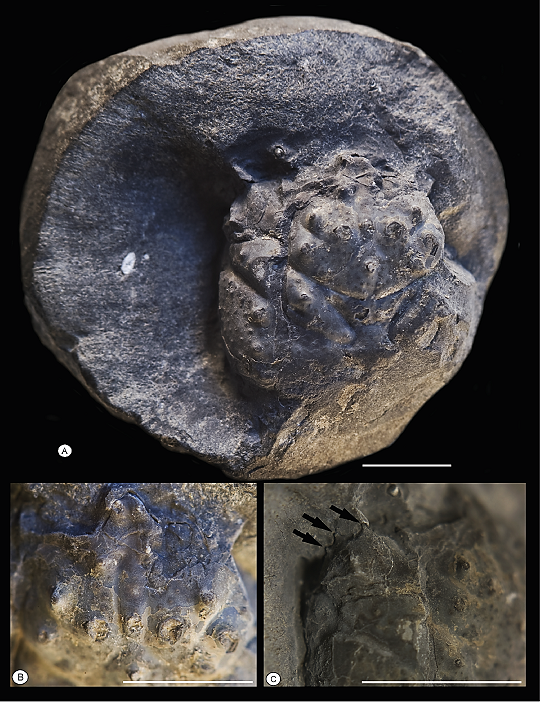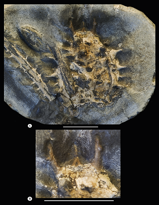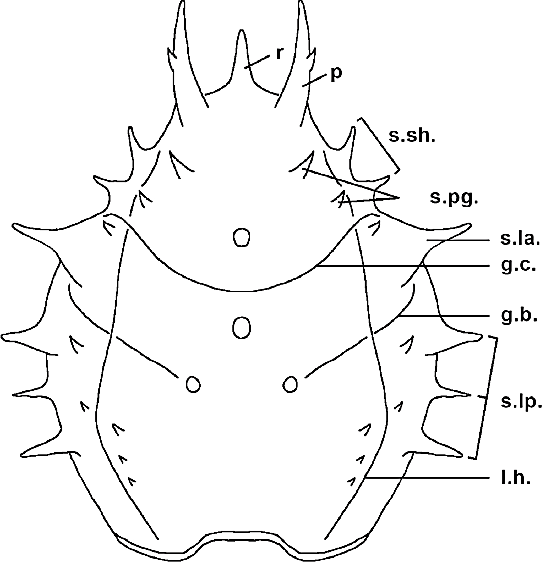 Description. Dorsal carapace longitudinally square in outline, as long as wide; well defined carapace regions; tuberculate dorsal surface, marked by strong calcified spines; rimmed anterior and posterior margins; well-developed linea homolica, sinuous in outline; straight lateral margins of dorsal carapace, weakly vaulted longitudinally and weakly vaulted transversely between linea homolica; simple rostrum, wider at the base, with rounded tip; one small lateral spinule, located close to the tip; angular subhepatic region with three subhepatic spines; straight and smooth antero- and posterolateral margins; straight posterior margin, weakly concave medially; each epigastric and protogastric region consisting of a large node, divided by a deep groove; epigastric region with three strong calcified spines; protogastric region with two strong calcified spines; poorly defined epi- and protogastric regions; well-defined meso- and metagastric regions, with one central prominent calcified spine; weakly depressed and poorly defined urogastric regions; poorly defined cardiac and intestinal regions; well defined and inflated epibranchial region, with two strong calcified spines; meso- and metabranchial regions positioned on either side of urogastric region, weakly inflated, with at least three strong calcified spines; deeply incised cervical groove, originating axially, curving anteriorly in concave arc toward linea homolica, deflecting around epibranchial region and extending across linea homolicain weakly concave arc around hepatic regions on flank; deeply incised branchiocardiac groove.