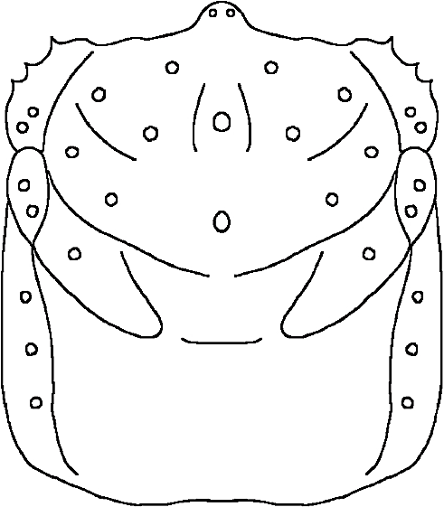 Diagnosis. Well defined dorsal carapace regions, marked by shallow incised grooves; long, pointed, and moderately upturned rostrum; dorsal carapace widest at level of the mesobranchial region, narrowing in anterior third; pseudorostral spines, slightly longer than rostrum and ornamented with one small median external spinule; anterolateral margin with one laterally-projecting spine; posterolateral margin strongly convex, rimmed by three laterally-projecting spines; posterior margin consisting of three arcs, one axially convex and two laterally concave; strongly spinose dorsal carapace.
