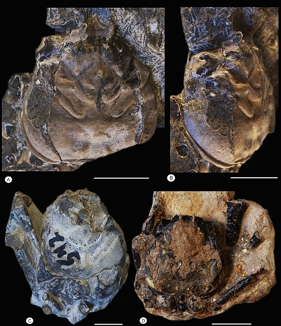 Discussion. The systematic placement of Palehomola gorrelli has always been troublesome. Rathbun (1926) described the linea homolica as “… partially visible on left side…”. Glaessner (1969) and Collins (1997) placed Palehomola within the Homolidae. Later Schweitzer (2001) suggested that Palehomola should be removed from the Homolidae based upon the lack of linea homolica. Even though Nyborg (2002) concurred with Collins (1997) in believing it to possess linea homolicaSchweitzer et al. (2004) assigned Palehomola to the Homolodromiidae, a placement confirmed later by Karasawa et al. (2011). Though we confirm the apparent lack of linea homolica in the holotype, according to Schweitzer et al. (2004), the study of the additional specimen, assigned to Palehomola gorrelli and discovered from the same locality of the holotype, clearly points out the presence of this characteristic. So, according to Glaessner (1969), Collins (1997), and Nyborg (2002), we remove Palehomolafrom the Homolodromiidae Alcock, 1900, assigning it once again to Homolidae.
