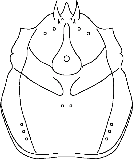 Description (based on holotype and additional specimens). Dorsal carapace longitudinally ovate in outline, longer than wide, widest at metabranchial region, narrowing in anterior third; well defined carapace regions; smooth dorsal surface; rimmed anterior and posterior margins; well- developed linea homolica, sinuous in outline; convex lateral margins of dorsal carapace, weakly vaulted longitudinally and weakly vaulted transversely between linea homolica; simple rostrum, pointed, well developed, axially sulcate, and strongly downturned; pseudorostral spines present on anterior margin, directed anteriorly and upward; pseudorostral spines slightly longer than rostrum and ornamented with two small basal spinules; angular, wide, and inflated subhepatic region, with one large triangular spine; antero- and smooth posterolateral margins; straight and rimmed posterior margin; each epigastric region consisting of a large anterior node, with two strong calcified spines; poorly defined epi- proto- and mesogastric regions; metagastric region well defined, with one central prominent calcified spine; weakly depressed and poorly defined urogastric regions; pentagonal cardiac region, narrowing anteriorly, smooth, with a pair of median pits; poorly defined intestinal region; mesobranchial regions positioned on either side of weakly inflated urogastric region; weakly inflated metabranchial regions, with at least three small spines; deeply incised cervical groove, originating axially, curving anteriorly in concave arc toward linea homolica, deflecting around epibranchial region and extending across linea homolicain a weakly concave arc around hepatic regions on flank; branchiocardiac groove deeply incised.