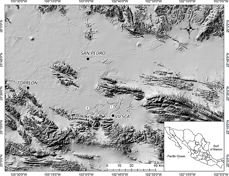 In sediments of two recently dried-up springs near the town of Viesca, Coahuila, specimens of two species of the genus Pyrgulopsis Call and Pilsbry, 1886 were collected. These shells have morphological similarities with shells of two endemic extant species of Pyrgulopsis from Cuatrociénegas, Coahuila-originally assigned to the genus Nymphophilus Taylor. The springs, as called by current researchers Túnel 4 and Túnel 8, are located at the foot of small hills in front of the Sierra la Cadena (Figure 1) and they belong to a system of several water bodies that have provided water to small settlements at the vicinity (Czaja et al., 2015). Both sites contain an abundance of shells, possibly including several new Cochliopidae species (Czaja, unpublished data). Only one of these species, Mexipyrgus viescaensis Czaja, Estrada-Rodríguez and Romero-Méndez, was described (Czaja et al., 2015). The spring sediments consist of small travertine pieces, shells, shell fragments (debris) and scant remnants of clay. Among the remains of aquatic vegetation, we found oogonia of Chara, seeds of Nymphaea(?) and endocarps of sedges (Cladium jamaicense Crantz and Schoenoplectus sp.). Microbialite (stromatolite) structures in form of tufa limestone were observed in both springs.