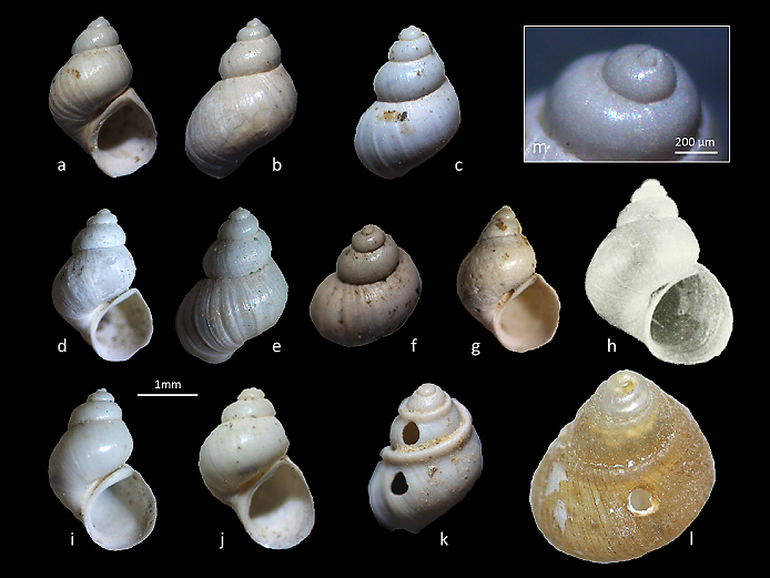 Description. Morphologically quite variable species, shell small to medium sized, ovate-conic to trochiform (Figure 2 a-e, f, l). The spire is moderately high, the base rounded, narrowly umbilicate, perforation almost complete covered by the columellar lip. The sutures are shallow. The aperture is oval in outline, longer than wide, adnate to or slightly separated from the penultimate whorl, angled adapically, rounded abapically. The aperture in lateral profile lies at an angle of about 15 - 25° (some specimens up to 35°, Figure 2j) to the coiling axis. Peristome complete, inner lip slightly thickened, outer lip thin. Protoconch flattened, near smooth, often eroded. Protoconch-teleoconch transition is in some specimens visible as a subtle change in sculpture (fine growth lines after 1.25 whorls, Figure 2n). Shells with 4.00 to 4.50 whorls, apical whorls rounded, following two whorls flattened to slightly convex giving the shell a trochoid shape (Figure 2e, f). Teleoconch whorls with coarses, wavies, and transverse growth lines. Ultimate and penultimate whorl frequently with a strong, bulb-like shoulder (Figure 2c, d) which in some specimens may be converted to a wing-like keel or collar (Figure 2i, j, o). The shells are whitish beige to light gray. Operculum not preserved. Shell measurements and whorl counts are given in Table 1.