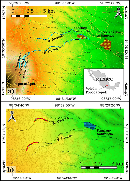 Hasta el año 2001, el volcán tenía un glaciar por debajo de la cumbre en la cara norte, con una superficie de 1.3 x 105 m2 (Delgado-Granados, 1997; Delgado-Granados et al., 2007). Hoy en día permanecen bloques de hielo (séracs) como remanentes de ese antiguo glaciar. Topográficamente abajo de los remanentes del glaciar hay tres gargantas a 4800 msnm, sus nombres de este a oeste son: Tenenepanco, La Espinera y Tepeteloncocone (Figura 1a), según la cartografía del INEGI (2015). Los cauces asociados a estas gargantas drenan la principal barranca de este sector conocida como Huiloac (3500 - 4000 msnm). La barranca Alseseca se localiza en el norte del volcán, inicia prácticamente desde el cráter y se desplaza en sentido N-NE (Capra et al., 2004). Las barrancas Huiloac y Alseseca unen su curso fluvial, tras cruzar el pueblo de Santiago Xalitzintla (Figura 1a) con una población de 2327 habitantes (Marcos et al., 2006; Andrés et al., 2007).