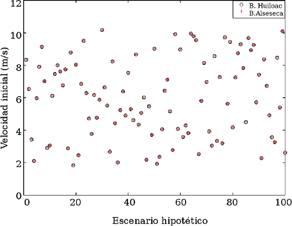 Con el fin de disminuir el costo computacional que representa modelar el flujo desde la cima con una velocidad inicial igual a cero (0), se decide ubicar la fuente del material en una parte intermedia, con un volumen distribuido en 3 pilas continuas (Figura 1b). Al no saber la velocidad que lleva el flujo en ese punto, se genera como incertidumbre adicional el valor de este parámetro, para determinar los rangos de velocidades mínima y máxima se hace necesario realizar simulaciones de prueba para los volúmenes mínimo y máximo. Resultando así que para los puntos de localización finalmente establecidos en este estudio, el rango de velocidades corresponde entre 1.8 - 10.2 m/s (Figura 2), las velocidades estimadas se encuentran dentro del rango del lahar de 2001 de 1.3 a 13.8 m/s (Muñoz-Salinas et al., 2007b).
