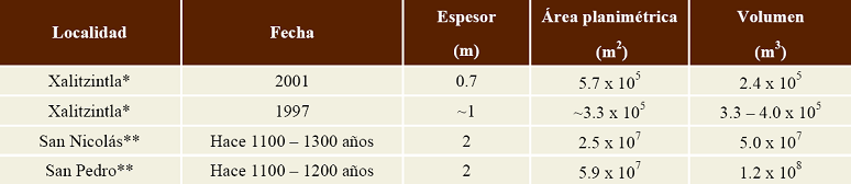 En la Tabla 1 se presentan algunos de los registros geológicos de depósitos asociados a la ocurrencia de lahares en el volcán Popocatépetl, observándose que en él, se han generado flujos de lahares hasta del orden de 108 m3 (Sheridan et al., 2001) de acuerdo al glaciar existente entre 1919 - 1927. Sheridan et al. (2001) modelaron lahares entre 107 m3 y 108 m3. Por su parte, Huggel y Delgado-Granados (2000) consideran que volúmenes de este orden tienen una baja probabilidad de ocurrencia. El volumen de los lahares asociados a una erupción más grande (pliniana) es de 7 x 107 m3 (González-Huesca et al., 1997; Julio-Miranda y Delgado-Granados, 2003).