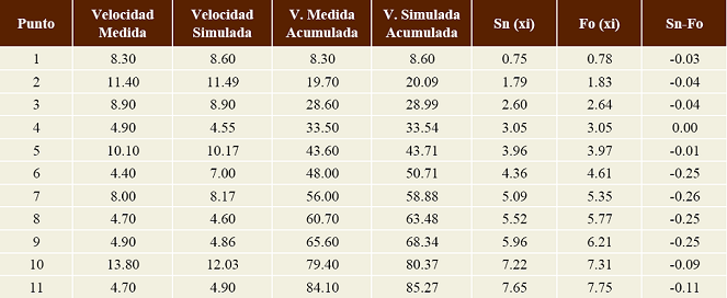 Los resultados de velocidad obtenidos para el modelado del lahar de 2001, fueron comparados con los reportados por Muñoz-Salinas et al.(2007b), para 11 sitios de depósitos evaluados, como se indica en la Tabla 2.