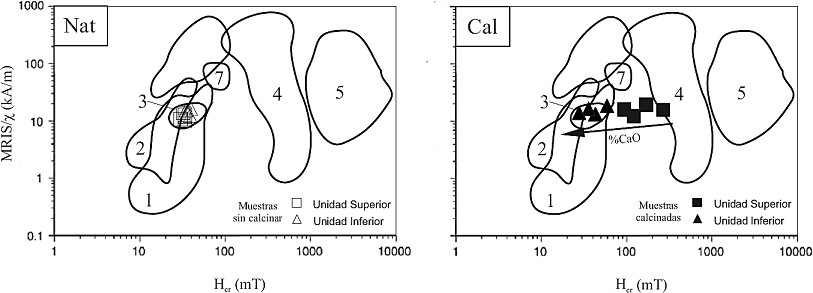 En cuanto a la mineralogía magnética de las muestras calcinadas, los valores elevados de Hcr y MRR, y los Coef. S cercanos a cero indicarían que en las muestras de la unidad superior predominan especies antiferromagnéticas, posiblemente hematita en función del color. En cambio en las muestras de la unidad inferior, los bajos valores de Hcr y MRR, los Coef. S cercanos a 1, así como los valores más elevados de los parámetros extensivos (χbf y MRI2.4T), son consistentes con una mayor contribución de especies ferrimagnéticas que en las muestras de la unidad superior. En el diagrama Hcrvs. MRIS/χbfde la Figura 5 se grafican las muestras calcinadas; es posible observar que las muestras de la unidad superior se aproximan al campo de hematita y las de la inferior a los campos de magnetita, titanomagnetitas y maghemita.