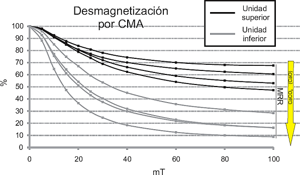 En la Figura 7 se indican las curvas de desmagnetización por CMA a partir de la MRI2.4Tde las muestras de la unidades inferior y superior; el valor obtenido a 100 mT de campo pico aplicado corresponde a la magnetización remanente residual (MRR). Como se observa en la Figura 7, las muestras de la unidad superior presentaron mayor resistencia al proceso de desmagnetización que las de la unidad inferior. La MRR osciló entre 8.8 % y 67.6 %, con un promedio de 37.2 %. En las muestras de la unidad superior se registraron valores destacadamente más elevados (promedio 57.2 %) que en las de la unidad inferior (promedio 17.5 %).