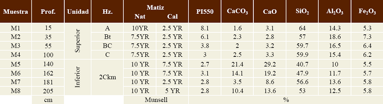 El contenido promedio de CaCO3 fue 7.2 % y varió entre 1.6 y 21.4 %. Las muestras de la unidad superior presentaron los valores más bajos (promedio 2.1 %) y las de la unidad inferior los más elevados (promedio 12.3 %). Cabe resaltar que las muestras con menor contenido de CaCO3 presentaron, luego del tratamiento térmico, los matices más rojizos (2.5 YR), en cambio las muestras con mayor contenido de CaCO3presentaron los matices más amarillos (7.5 YR).