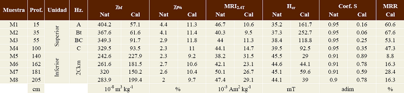 La MRI2,4T promedio fue 44 x10-3 Am2kg-1, osciló entre 38.2 y 50.1 x10-3 Am2kg-1; en ambas unidades el valor fue cercano al promedio.