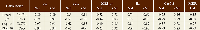 Dado que la principal diferencia entre ambas unidades corresponde al contenido de CaO (o bien CaCO3 inicial), a los fines de relacionar la variación de los parámetros magnéticos obtenidos en las muestras calcinadas, se calcularon los coeficientes de correlación lineal (R) y log 10 (Rlog10), entre los contenidos de CaO y CaCO3, y los parámetros magnéticos (Tabla 3). En todos los casos los coeficientes de correlación fueron fuertes a muy fuertes, donde Rlog10 presentó en la mayoría de los casos correlaciones levemente más fuertes que R. Los coeficientes de correlación fueron levemente más fuertes para CaO que para CaCO3. Las correlaciones positivas fueron con χbf, MRI2,4T, y Coef. S, y las negativas con χbf, Hcr y MRR. En la Figura 8b se muestran los gráficos CaO vs. Hcr y CaO vs. Coef. S, y se indican las muestras de las unidades superior (cuadrados negros) e inferior (triángulos negros). En la misma se puede observar que a partir de contenidos de aproximadamente entre 4 y 8 % de CaO la señal de la fase ferrimagnética en las muestras calcinadas se vuelve dominante.
