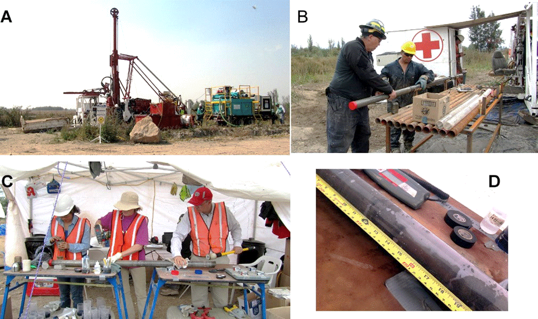 La perforación fue realizada por la compañía Major Drilling de México, empleando sistemas de perforación HQ y NQ con broca de diamante (Figura 5A y 5B). El tipo HQ fue utilizado para recuperar los sedimentos lacustres, relativamente suaves; esta herramienta perfora un pozo de 96.1 mm de diámetro y obtiene núcleos de sedimento de 63.5 mm de diámetro y aproximadamente 1.5 m de largo, que fueron recuperados dentro de en una camisa de plástico (Figuras 5C y 5D). La herramienta NQ fue utilizada para perforar el material más resistente (rocas y materiales volcaniclásticos), esta herramienta perfora pozos de 75.7 mm de diámetro y obtiene núcleos de roca de 47.6 mm de diámetro y aproximadamente 1.5 m de largo, los cuales se recuperan en una caña de metal y se traspasaron a cañas de plástico del mismo diámetro. Durante la perforación se utilizaron bentonita en polvo y polímero biodegradable de celulosa, para aumentar el desempeño del fluido de perforación (estabilización del pozo, lavado de recortes, sellado de las fracturas de pozo, etc.). Las operaciones de perforación iniciaron el 23 de febrero y terminaron el 30 de marzo de 2016. Durante este tiempo se perforó de manera continua (24 horas/7 días a la semana).
