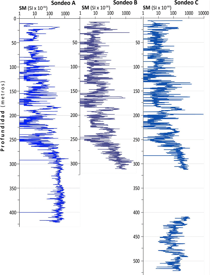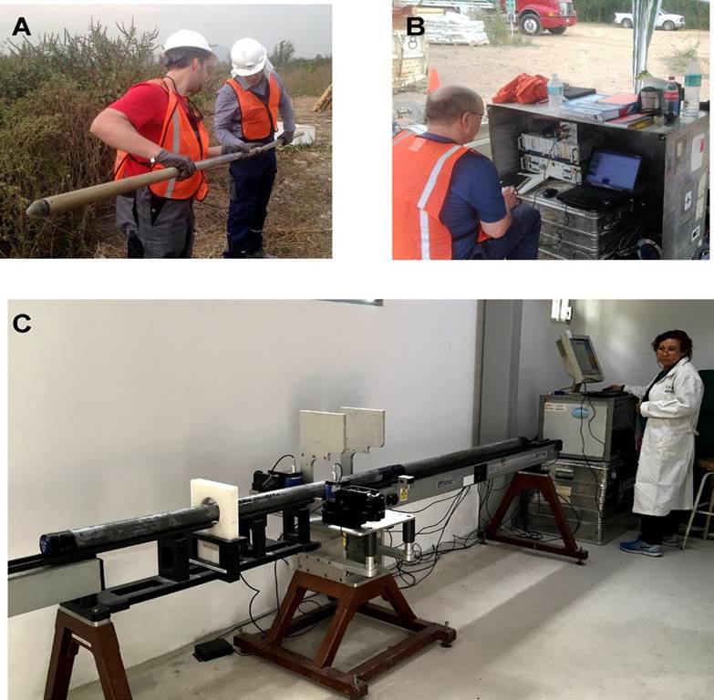 Durante la perforación de todos los pozos, los núcleos recuperados y documentados en el sitio de perforación diariamente, y fueron trasladados al Instituto de Geología, de la UNAM, donde todas las secciones fueron montadas en un equipo automatizado GEOTEK en el que se realizaron mediciones de susceptibilidad magnética a intervalos regulares de 4 cm con un sensor de anillo Bartington (MS2C) (Figura 6C). Las gráficas generadas con estos datos fueron muy importantes para las decisiones diarias durante la perforación de los pozos, ya que permitieron ubicar de manera general el tipo de sedimento (lacustre vs. volcánico) que se había atravesado y establecer correlaciones con los pozos anteriores.