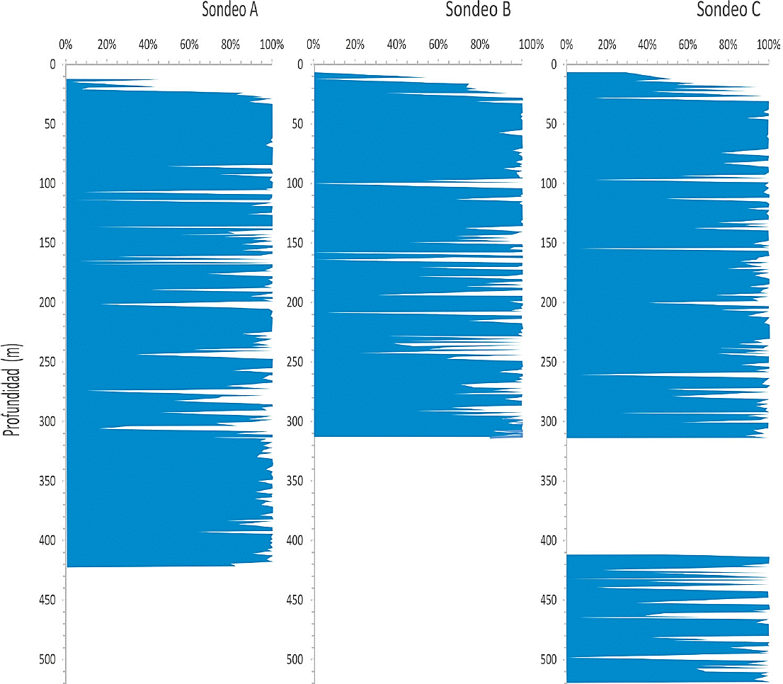 La recuperación de la secuencia sedimentaria de Chalco fue en general alta (> 85 %), variando a lo largo de cada sondeo (Figura 7). En el sondeo 1A el porcentaje de recuperación global alcanzó el 88 % obteniéndose la mejor recuperación entre los 30 a 80 m y de 310 a 420 m de profundidad. En el sondeo B, el porcentaje de recuperación global fue de 91 % con la mejor recuperación entre 30 a 90 m. En el sondeo C se obtuvo un porcentaje de recuperación global del 92 % con la mejor recuperación entre los 30 a los 260 m. A partir de la correlación entre tres sondeos se construirá la secuencia maestra.