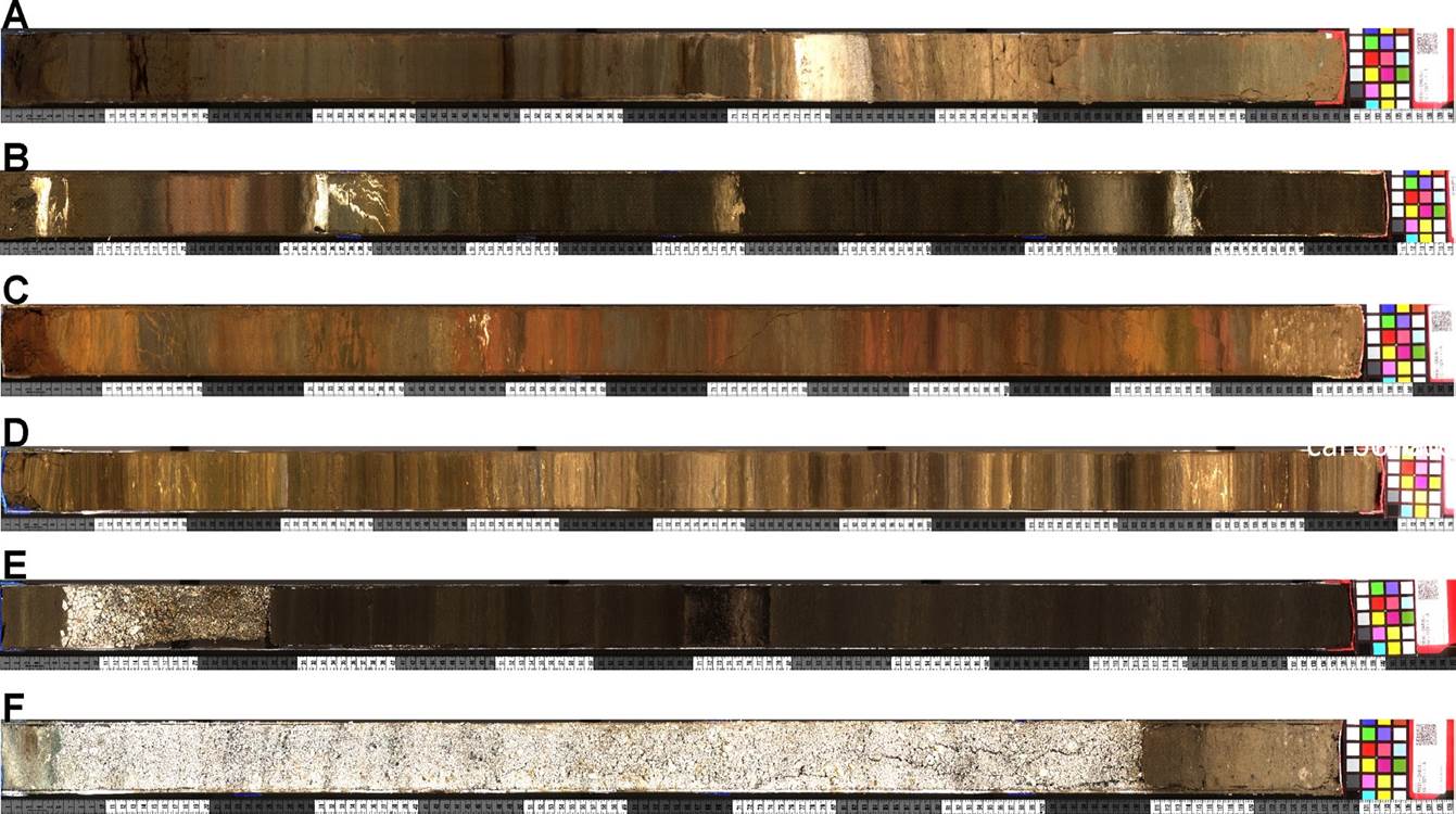 Se presentan ejemplos de algunas secciones de la secuencia sedimentaria (Figura 8A - 8F) donde según la textura del sedimento, fueron recuperadas arcillas limosas café con oozes de diatomeas con carbonatos masivos, sedimentos finamente laminados con oozes de diatomeas café claro y rojizos, sedimentos volcaniclásticos con cenizas y lapilli.