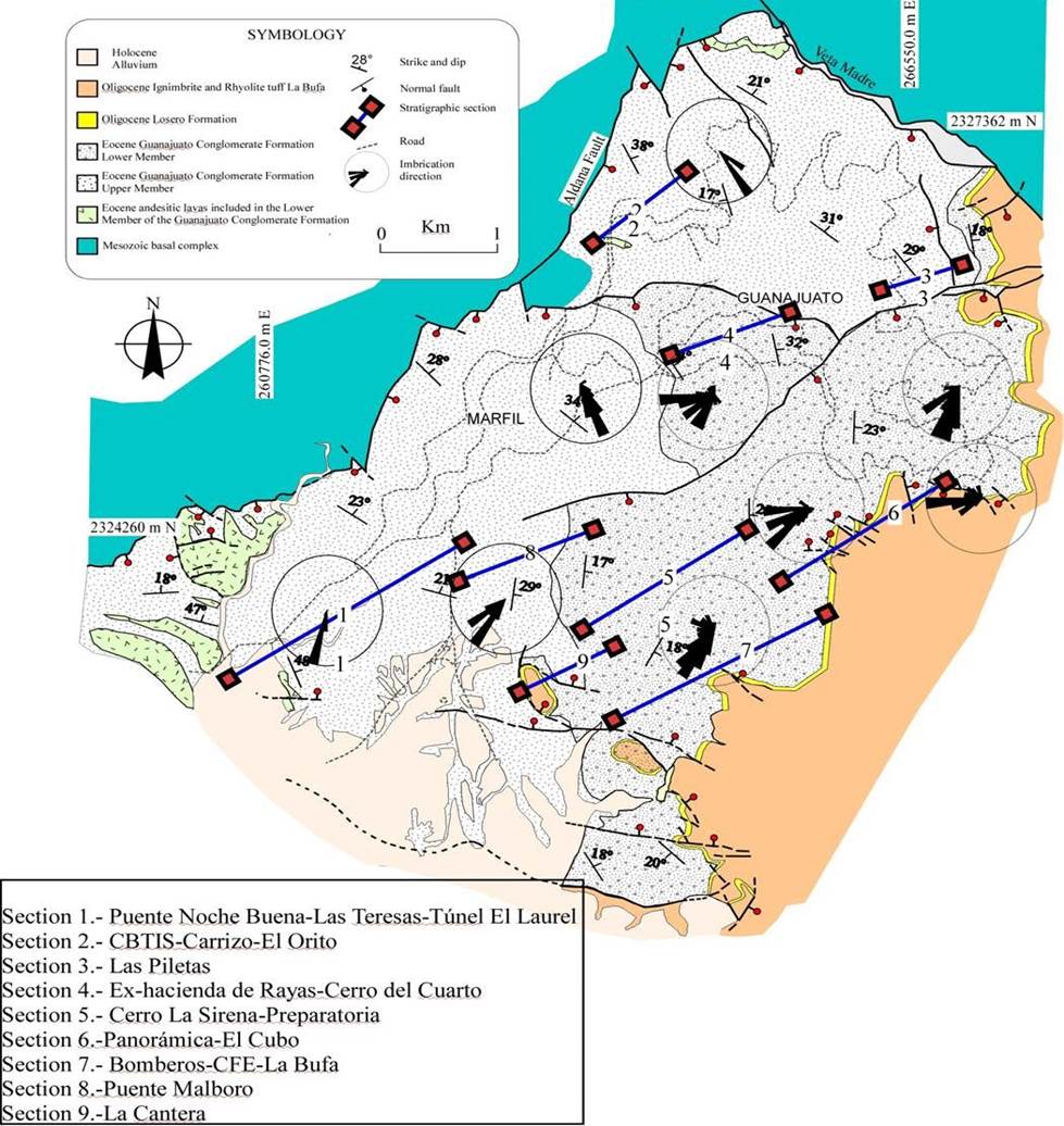 The Guanajuato Conglomerate (GC) is considered of Eocenic age (Ferrusquía-Villafranca, 1987; Aranda-Gómez and McDowell, 1998) with a thickness between 1500 and 2000 m, and was divided by Edwards (1955) in two members. The Lower member unconformably overlies a Mesozoic assemblage and has a thickness between 700 to 1300 m. The Lower member is composed of two parts: 1) basal conglomerate and sandstone intercalated with andesitic lava flows (Figure 2 and 3). The basal part of the Lower member (145 m) was measured in section 1, and section 2, located in the western part of the study area (Figure 1). Outcrops in these sections consist of clast-supported conglomerate with predominant volcanic clast (43 %), diorites (22 %), and minor proportion of granitic (6 %), Quartzites (9 %), metasediments (16 %) and sandstone clast (4 %); 2) the top part of the Lower Member is a clast-supported and matrix-supported conglomerates and sandstones intercalated with mudstones (Figure 2 and 3). It is located in the northeastern part of the study area, in section 3, section 4 and section 5, (Figure 1). Maximum thicknesses of 1000 m consist of clast-supported conglomerate with volcanic, metasediments, granite and limestone clasts. These deposits conformably on the basal part of the Guanajuato conglomerate. The Upper Member varies from 170 to 1300 m, toward the southeast. The contact between the Lower and Upper Member is an erosional unconformity of undetermined age (Edwards, 1955). Outcrops in section 6, section 7, section 8 and section 9 located in the northwest area consists of clast-supported conglomerate with a higher granite clast than volcanic and metasediments.