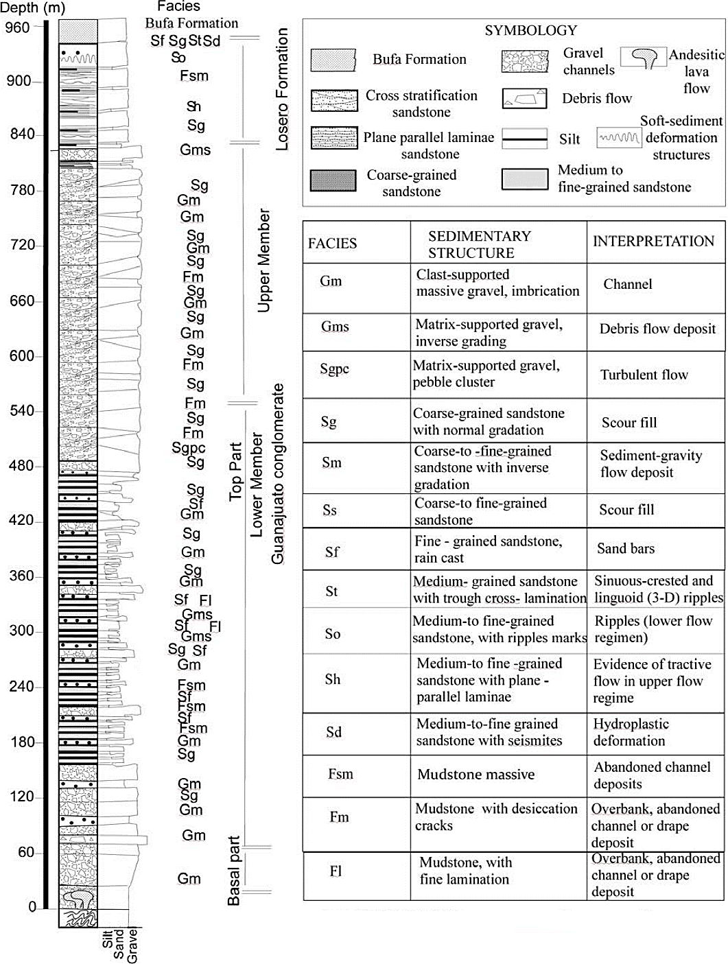In the present study, a conceptual model has been constructed to provide an idea about the paleogeography and environments of deposition of the Guanajuato Conglomerate (Figure 10). Internal sedimentary structures, boundary conditions, facies, their interrelationships, and facies association suggest deposition under channelized condition in moderately sinuous stream in an alluvial fan (Lower Member) to fluvial plain (Upper Member and Losero Formation) setting (Figure 11). The sedimentary facies, sequence, and their vertical changes in facies association indicate a progressive decrease in coarse clastics and an increase in fine clastics. The evidence for this comes from the fining-upward channel-fill sequences which were built up by numerous flooding events as indicated by the desiccated mud drapes and internal erosion surfaces. The analysis of facies types and facies assemblages in the Guanajuato Conglomerate suggests an alluvial fan and fluvial depositional environments dominated by streams. Two identified informal members (Lower and Upper) of the Guanajuato Conglomerate resemble characteristics of the facies associations (G1, G2, S1, S2, S3, F1 and F2) in an alluvial fan fluvial depositional environment. The Clast-supported to matrix-supported Gravel Bed (G1, G2) interbedded with sandstones beds (S1, S3 and F1, F2) form the Lower Member of the sequence. The Upper Member is characterized by alternating beds of clast-supported to fine- and coarse-grained sandstone to siltstone (G1, S1, S3, F1 and F2). The abundance of coarse-grained facies and the relative scarcity of mud-dominated facies in this association suggest that deposition occurred primarily in a bedload-dominated stream system (Schumm, 1977; Galloway, 1981). Deposits of this facies association commonly display fining and coarsening upwards sequences that are less than 30 m thick. The vertical transition from the Lower Member to the Upper Member of the Guanajuato Conglomerate reflects a marked change in the fluvial architecture. It is observed that he Lower Member is represented by channels (CH) and channels fills (HO), sediment gravity-flow deposits (SG), sandy bedforms, and overbank fine (FF), while that Upper Member is dominated by channels fills (HO) (Figure 11). Regionally, the proportion of overbank sediments increases to the south, where the sediments con-sist of dominantly mudstone and thinly, bedded sandstone. The average grain size and proportion of sandstone in outcrop increases up section and eastward.