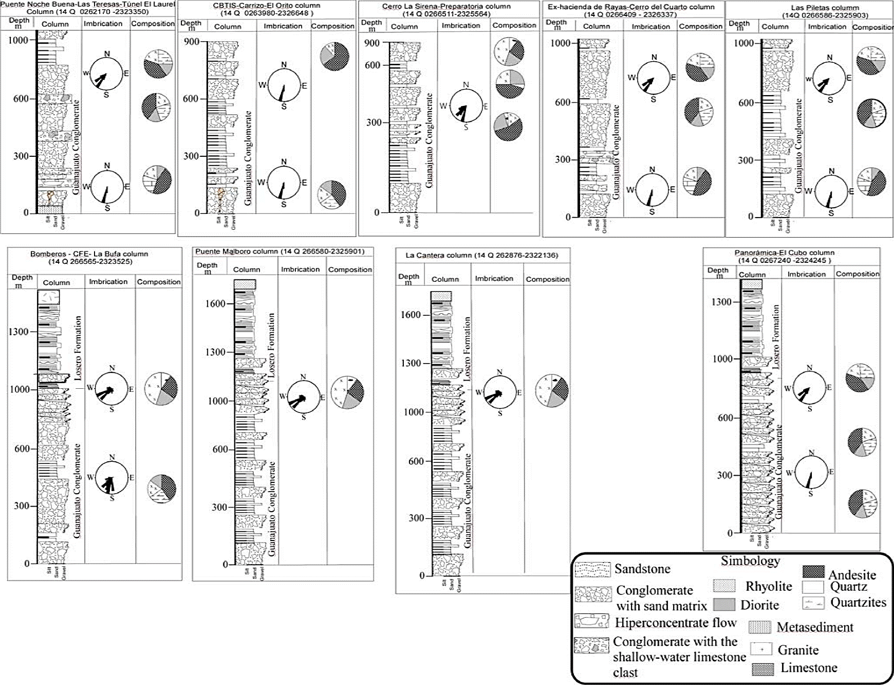Facies, facies associations, architectural elements, bounding surfaces and analysis of paleocurrent directions were studied. The sedimentology of the Guanajuato Conglomerate (GC), was analyzed in nine stratigraphic sections (Figure 1) along small streams (e.g. Las Piletas, El Orito, and Malboro) and road cuts (Puente Noche Buena, Las Teresas, CBTIS, Carrizo, ex-hacienda de Rayas, Cerro del Cuarto, Cerro La Sirena, Preparatoria, Panorámica El Cubo, Bomberos, CFE, La Bufa and La Cantera). Stratigraphic sections were measured in nine localities: Puente Noche Buena-Las Teresas-Túnel El Laurel (section 1), CBTIS-Carrizo-El Orito (section 2), Las Piletas (section 3), Ex-hacienda de Rayas-Cerro del Cuarto (section 4), Cerro La Sirena-Preparatoria (section 5), Panorámica-El Cubo (section 6), Bomberos-CFE-La Bufa (section 7), Puente Malboro (section 8) and La Cantera (section 9) (Figure 1). In each locality, we made detailed sedimentological lithofacies and facies associations using a modified lithofacies and architectural Miall’s (1996) classification scheme. The reconstruction of sedimentary bodies (architectural elements), and their bounding surfaces, including their lateral variability, were derived from interpretation of outcrop profiles and photomosaics of lateral continuous outcrops using the architectural elements (Miall, 1996). Detailed columnar sections were constructed based on textures, sedimentary structures and their association. Pebble composition was studied in all sections. The composition was determined directly in the field by counting pebbles of different lithology occurring within a 50 x 50 cm2 grid, having individual 10 x 10 cm2 square. The grid was moved laterally on the same bed at least five times in order to have a minimum count of 100 pebbles. A total of 900 clasts were counted in nine sections. Pebble compositions were plotted in a pie diagram of clastic compositions and located in the columnar sections. More than 218 paleocurrent indicators were measured in imbricated pebbles in conglomerates in the nine localities studied, to distinguish dispersal patterns.
