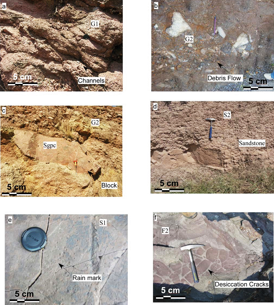 Deposits of facies associations G2 are interpreted as in-channel and outwash sediments deposited during major floods. Matrix-supported cobble and boulder-dominated facies deposits commonly reflect mass transport and deposition as debris flow deposits (Bull 1972; Miall 1977, l978). In subaerial environments, debris flows are commonly into hyperconcentrated flows when they encounter a streamflow (Pierson and Costa, 1987; Costa, 1988). A transition facies is produced during these events, comprising both debris-flow and hyperconcentrated flow deposits in one sedimentation unit (Scott et al., 1995; Sohn, 1999). Dasgupta (2007) suggested that these types of facies could be found in an alluvial fan system. Liquefaction is a common mechanism for the generation of hyperconcentrated density flows and is considered the most frequent mechanism for triggering subaerial debris flows (Iverson et al., 1997). The lack of grading can also be explained as a result of reworking of deposits at the head of flow because of fast speed downslope movement, causing syn-depositional mixing and churning and rapid deposition as flow competence declines (Hein, 1982). Hence, this facies are the proximal part of the fan a sudden break in the slope generated hyperconcentrated flows in small basins with shallow water depths, particularly in tectonically active settings (Mutti et al., 1996). Architectural elements include sediment gravity-flow deposits (SG).
