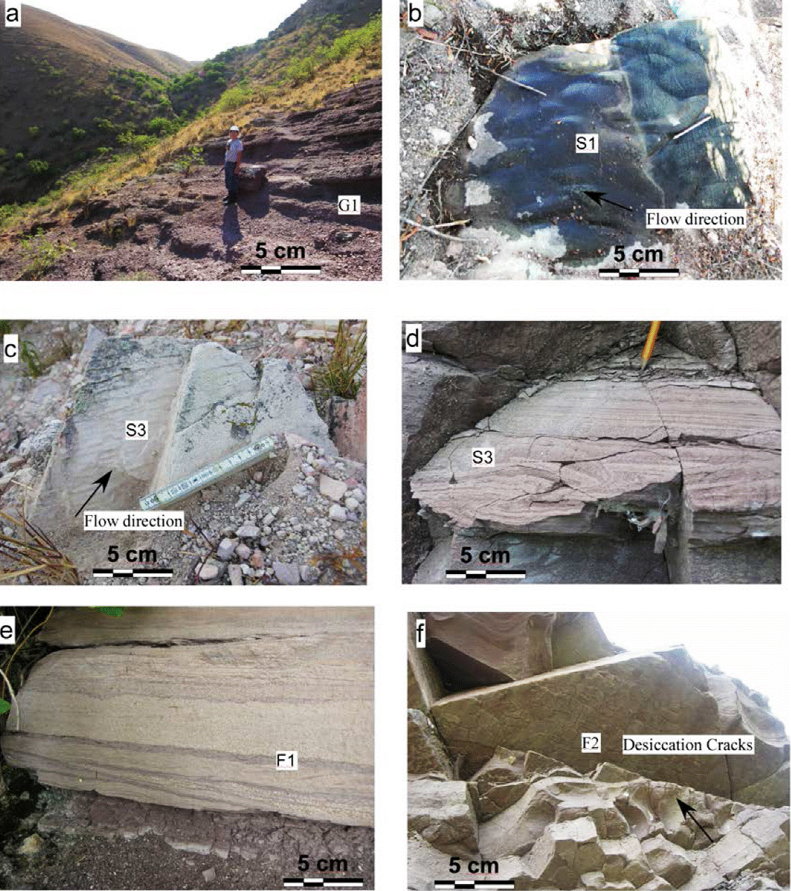 4.2.2.3. Scour and-Fill Sand (S1). The major tabular and lenticular sandstone S1 is common in the Guanajuato Conglomerate. They are composed of Sg, Ss, Sh, and Sf facies (Table 1, Figure 4). The Sg and Ss sandstone beds are massive. The sand grains are angular to subround, and poorly to moderately sorted, composed of quartz, feldspar, lithics and minor, dark, heavy minerals. The matrix is silty. Facies associations S1 occur as single and multilayered units, which commonly exceed hundreds of meters in lateral extent. Tabular sandstone bodies have thickness ranges from 0.3 to 1 m. Poorly developed, coarse to pebbly sandstone facies commonly overlies the conglomerate and grades vertically into coarse to medium-grained sandstones. The facies Sh and Sf (light brown, or red) consist of either poorly sorted, medium to very coarse-grained sandstone that include granules and minor pebbles or well-sorted, fine to medium-grained sandstone. Lower and upper contacts of rock units and beds are either erosional or non-erosional. Strata show tabular geometry. Parallel lamination and rain casts are common primary structures. Thin strata of mudstone and siltstone separate the successive sandstone bodies (Figure 4).