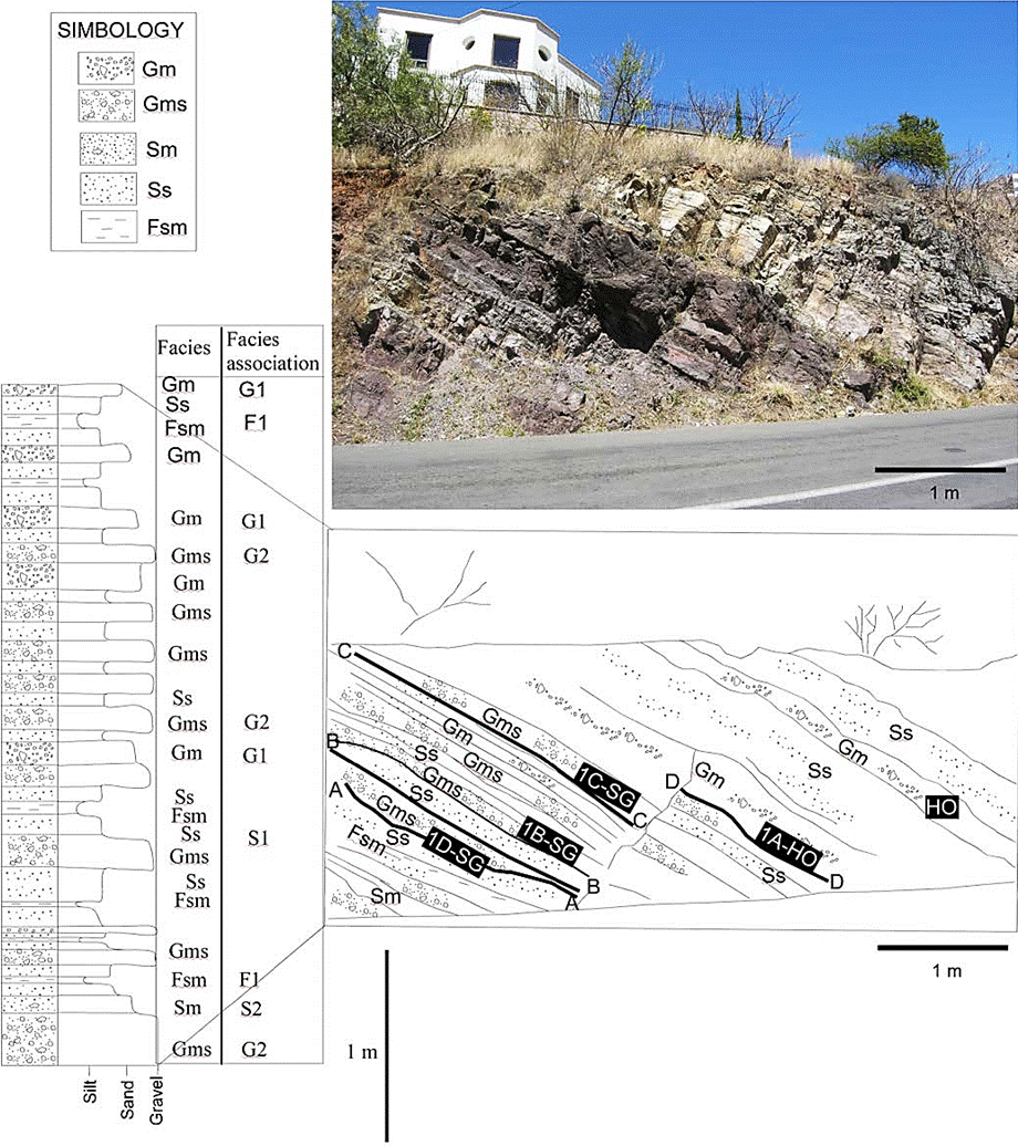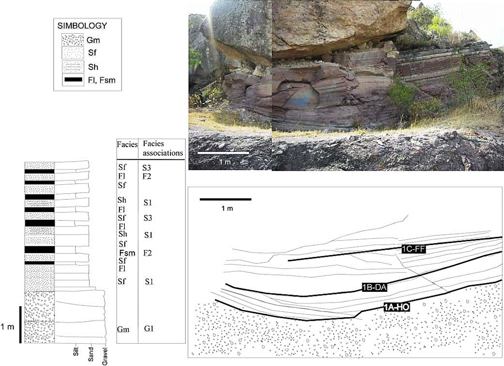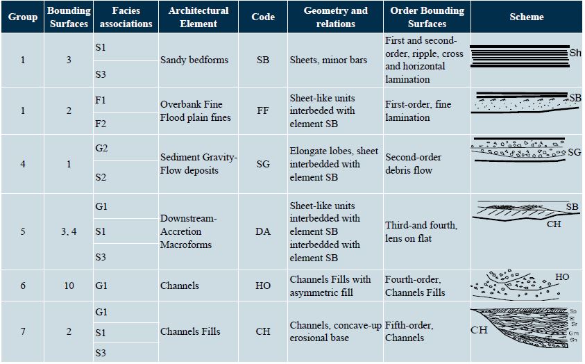 Five architectural elements were recognized: channels (CH, HO), sediment gravity flow deposits (SG), sandy bedforms (SB), downstream-accretion macroforms (DA) and flood plain fines (FF). Not all of these features were observed at each outcrop (Table 3). These elements defined by their geometries and bounding surfaces (Miall, 1996), form the basis for interpreting depositional environments.