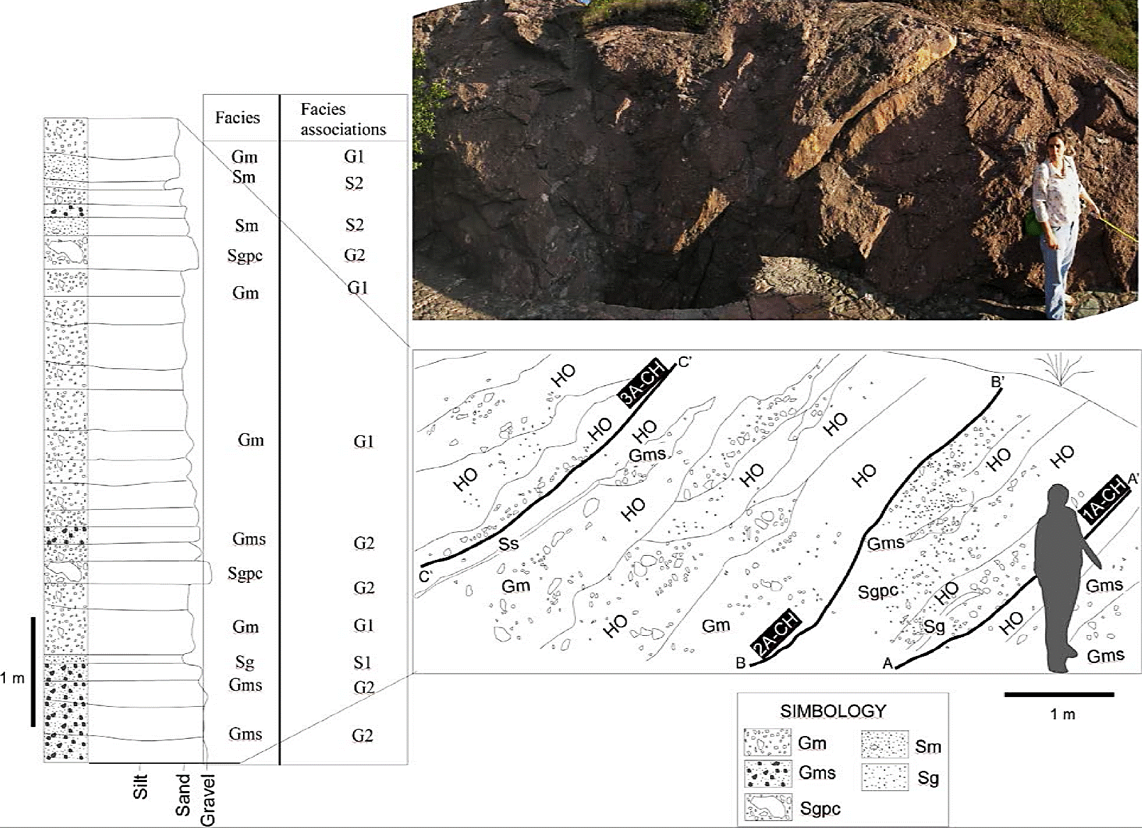 4.2.3.3. Sand Channels (S3). The facies associations S3 are constituted by facies Sf, So, St, Sh and Sd (Figure 5). It consists of brown to red, fine to coarse-grained, moderately to poorly sorted, subangular to subrounded sand, and unconsolidated to weakly cemented. Sandstones facies display massive bedding, plane and horizontal stratification and planar and trough cross-stratification in 10 cm to 1 m thick tabular sets. The facies St consist of either poorly sorted, medium-grained to pebbly sandstone, or moderately sorted, medium to coarse-grained sandstone. Lower and upper contacts of co-sets and sets are sharp and erosional. The facies Sh (light brown, or red) consists of either poorly sorted, medium to very coarsegrained sandstone containing granules and minor pebbles or well-sorted, fine to medium-grained sandstone. Lower and upper contacts of rock units and beds are either erosional or non-erosional. Strata show tabular geometry with ripples, rain casts and soft-sediment deformation. Sandstones facies commonly grade upwards into facies associations F1 and grade downwards into G1. Sand is composed dominantly of quartz and feldspar grains, and with lesser granitic, andesitic, rhyolite, and phyllite fragments.