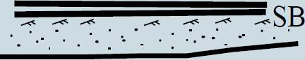 These facies associations are interpreted as mixed in-channel sediments. Deposition of parallel lamination, stratified, sand-dominated lenses and beds reflect aggradation of transverse and longitudinal sand bars and dunes (Miall 1977, 1978). Architectural elements include sandy bedforms (SB).