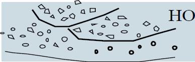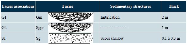 The absence of sedimentary structures, and the poor sorting and mixing of fine and coarse material suggest that G1 was deposited by gravity flow, probably of a debris flow nature. The lack of grading can be explained as a result of reworking of deposits at the head of a flow by its more turbulent movement, causing syn-depositional mixing and churning and rapid deposition as flow competence declines (Hein, 1982). Architectural elements include channels (CH, HO) and poorly developed Downstream-Accretion Macroforms (DA).