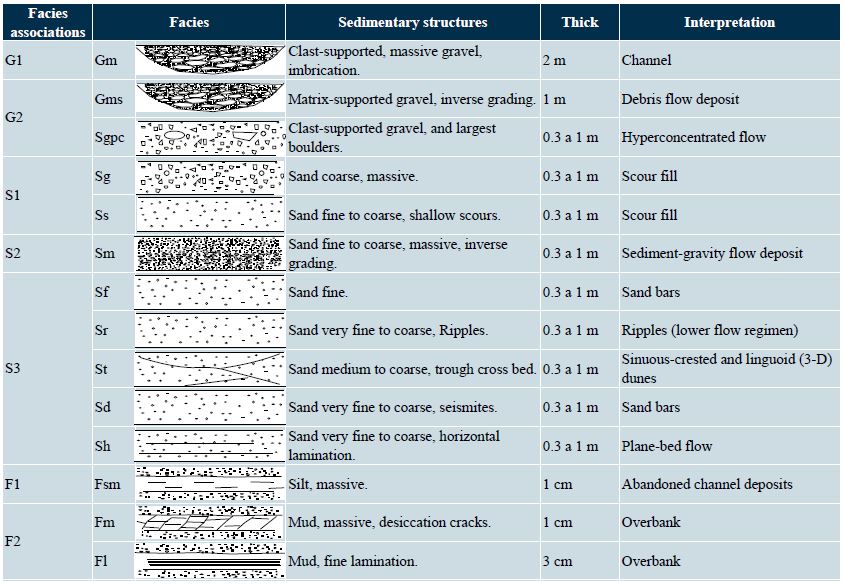 Channel deposits comprise facies associations G1, S1 and S3. In the Lower and Upper Member of the Guanajuato Conglomerate, the channel deposits have sharp erosional bases, often erode sand bedforms and other channels. Their geometry is of the concave channel, locally forming a multistory channel geometry. The channel thicknesses vary from 1 m to 2 m in most cases. Channel widths vary between 2 m to 4 m.