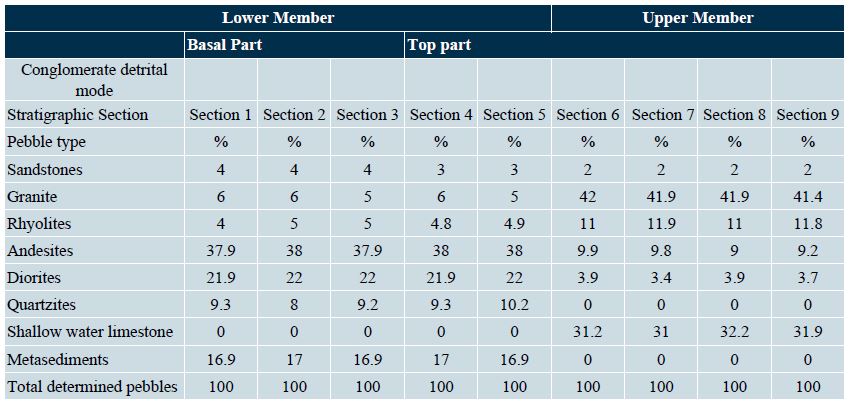 The results of pebble counts are reported in Table 4. Clast shape is predominantly sub-angular to sub-rounded. Andesite and diorite are the most abundant igneous rock types; quartzite and phyllite are the most metamorphic rock, which occur in variable amounts in the Lower Mem-ber of the Guanajuato Conglomerate ENT#091;(andesite (37.96 %), diorite (21.96 %), phyllite (16.94 %), quartzite (9.2 %), granite (5.6 %), rhyolite (4.74 %), and sandstone (3.4 %)ENT#093;. Granite and limestone clasts are dominant in the Upper Member ENT#091;granite (41.8 %), limestone, (31.57 %), rhyolite (11.43 %), andesite (9.48 %), diorite (3.72 %), and sandstone, (2%)ENT#093;. The Arperos assemblage seems to be the main source of metamorphic rocks for the Guanajuato Conglomerate (Miranda-Avilés et al., 2016). Volcanic rocks apparently are from Mesozoic petrotectonic assemblages. Sedimentary clasts are mainly limestone pebbles from the Arperos Basin assemblage (Omaña et al., 2015). Plutonic rocks are mostly composed of granite derived from exhumed intrusion. The increase of plutonic and sedimentary pebbles in the Upper Member is counterbalanced by a decrease of metamorphic and volcanic clast, which disappears up to the northeast of the study area.