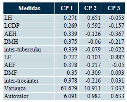 En el PCA, los componentes 1 y 2 explicaron el 79 % de la varianza. En el componente 1 se aprecian las dimensiones de ancho de los húmeros y fémures y en el componente 2 las principales medidas de longitud (Tabla 1).