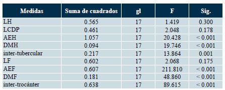 Las medidas cuya significancia diferenciaron los húmeros de la forma fósil y actual de C. niausa en el ANOVA, fueron: el ancho inter-tubercular del húmero (p = 0.038) y aunque menos significante el ancho epicondilar (p = 0.041).