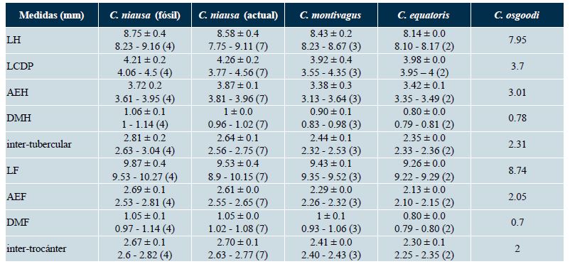 En promedio, la forma fósil de C. niausa presentó los tubérculos mayor y menor del húmero (inter-tubercular = 2.81 mm), más grandes respecto a la actual (inter-tubercular = 2.64 mm), así también al presentar un mayor índice epicóndilo-femoral (Tabla 3), tiene una mayor fuerza en la flexión de los dedos del pie y el pie. El fósil de C. niausa posee en promedio un fémur más largo (9.87 mm) que la forma actual (9.53 mm).