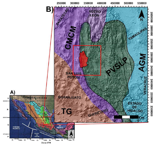 La CVH se sitúa dentro de la zona límite de las provincias de la Mesa Central (MC) en el oeste, conformando a su vez la parte sur de la provincia extensional Basin and Range (Aranda-Gómez et al., 2000; Nieto-Samaniego et al., 2005; Tristán-González et al., 2009).